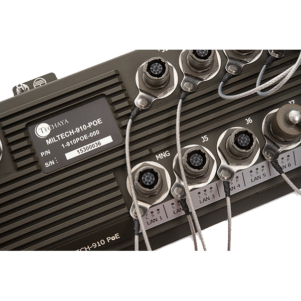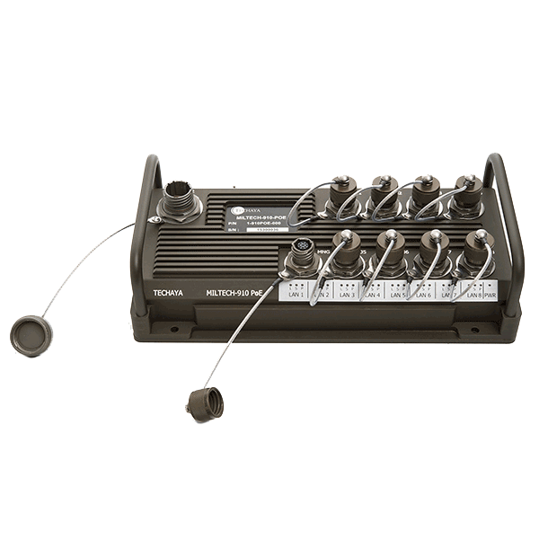 The MILTECH 910-PoE is a rugged Power over Ethernet (PoE) switch that supports 60W of PoE on all 8 Gigabit Ethernet 10/100/1000 ports. It is specifically designed for complex traffic applications featuring IEEE-STD-1588 (PTP) Capabilities and Synchronous Ethernet (SyncE).